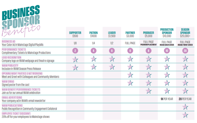 Across 16 seasons, WAM has presented more than 60 stories and donated over $105,000 to our community. Now we are seeking to deepen relationships within our community and engage companies, organizations, and brands that are mission-aligned and share our values to develop fundraising campaigns, cause marketing, co-branded products, and awareness about WAM’s mission and community partners in order to increase our impact in the years to come.
